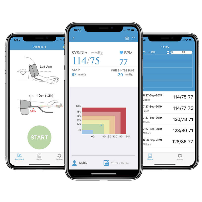 • Support multiple user management and blood pressure trends on App